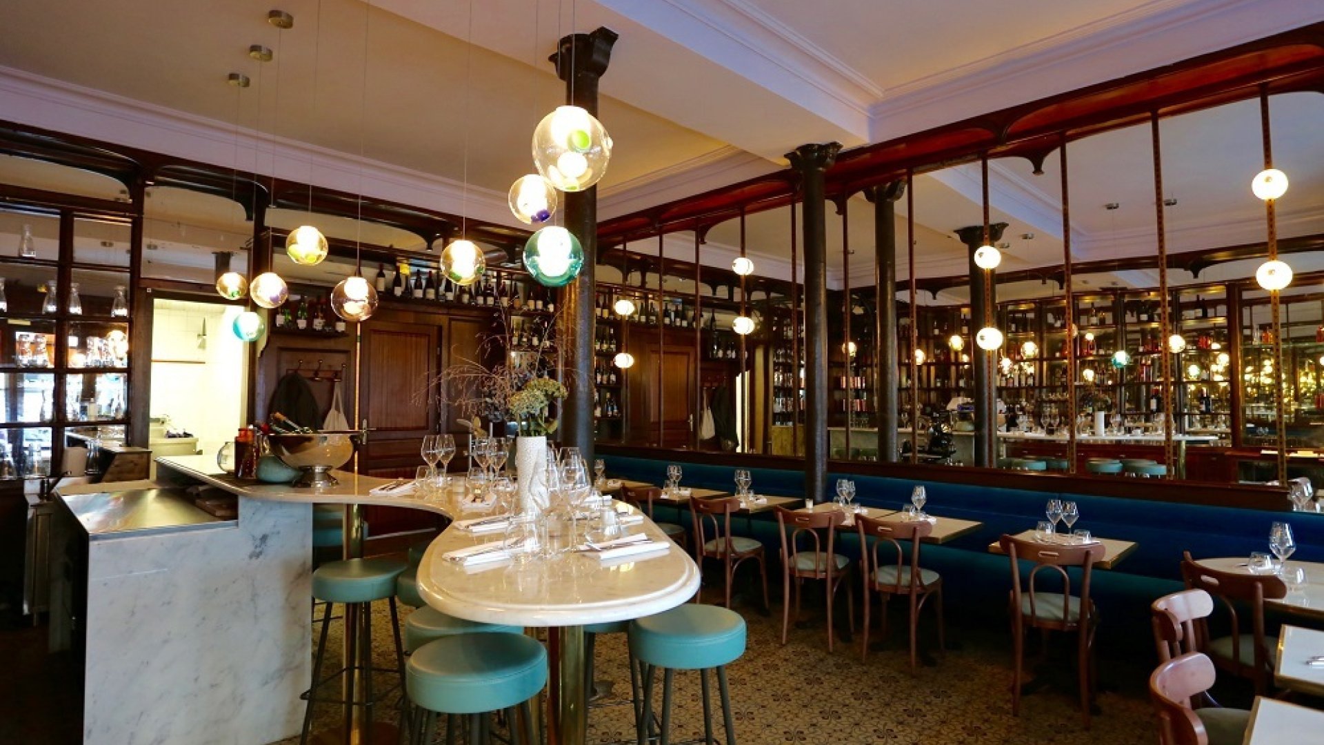 Restaurant bistronomique dans un esprit "apothicaire", comptoir en marbre, banquettes bleues et saveurs françaises modernes au gré des saisons et des producteurs.